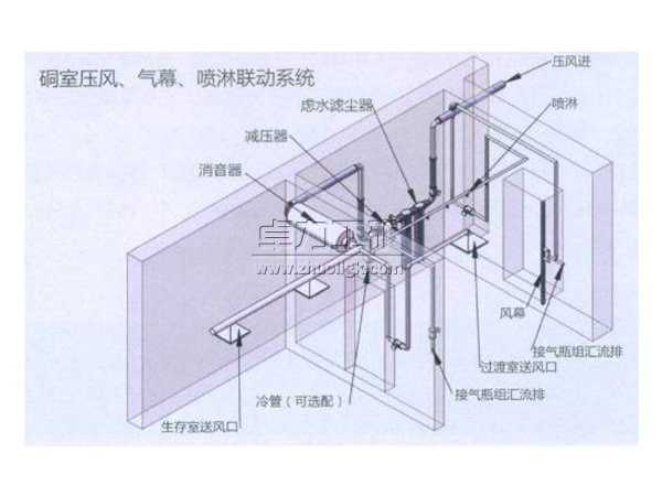 氣幕噴淋系統(tǒng)主要解決外界有毒有害氣體進(jìn)入硐室和過渡室換氣問題。氣幕吹洗是在第一道門內(nèi)側(cè),使壓縮空氣通過氣幕管形成致密的氣簾,阻擋外界空氣的進(jìn)入,同時(shí)掃除外界進(jìn)入人員身上攜帶的有毒有害物質(zhì)。噴淋則是通過注入大氣量的新鮮壓縮空氣,將有害氣體稀釋并通過泄壓閥排放到室外,以達(dá)到降低有害氣體濃度并凈化的目的。
