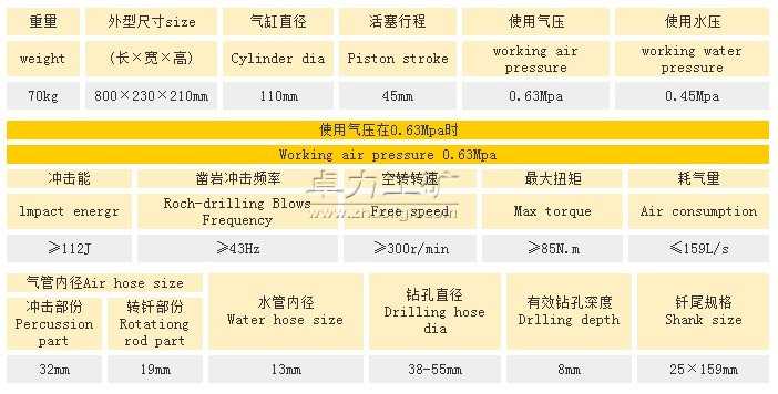 YGZ70回轉(zhuǎn)鑿巖機(jī)使用轉(zhuǎn)釬扭矩大,沖擊次數(shù)高,因具有沖擊與回轉(zhuǎn)各自獨(dú)立并可分別調(diào)節(jié)的結(jié)構(gòu),故鑿巖時對各種巖石的適應(yīng)性強(qiáng),不易卡釬。正確使用,合理調(diào)節(jié),在各種巖石上均可獲得較高的鑿巖速度。