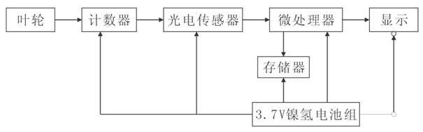 測量時,因?yàn)槿~輪旋轉(zhuǎn)對光電傳感器形成遮擋,每遮擋一次就產(chǎn)生一個光脈沖信號,脈沖信號經(jīng)計數(shù)器傳送到微處理器進(jìn)行運(yùn)算處理后,經(jīng)顯示器顯示或存入存儲器保存。