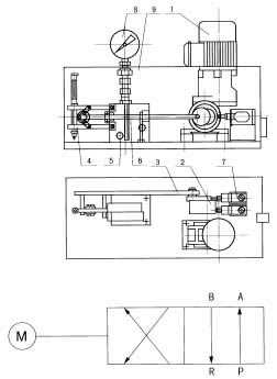 電動(dòng)機(jī)經(jīng)蝸輪蝸桿減速后,由偏心輪2帶動(dòng)連桿3 作直線往復(fù)運(yùn)動(dòng)。由于連桿末端所連動(dòng)的彈簧機(jī)構(gòu)4的作用,使二位四通閥5中的滑芯桿6產(chǎn)生急速的推拉動(dòng)作,從而改變二位四通閥各油口的聯(lián)接方式,達(dá)到液流換向的目的。此時(shí),偏心輪旋轉(zhuǎn)了180°到達(dá)另一個(gè)死點(diǎn)位置,觸動(dòng)了限位開關(guān)7。限位開關(guān)即可送出脈沖信號(hào),停止閥電機(jī)運(yùn)行,完成了一個(gè)工作過程。壓力表8裝于防護(hù)罩9頂部用于監(jiān)視閥內(nèi)的工作壓力。