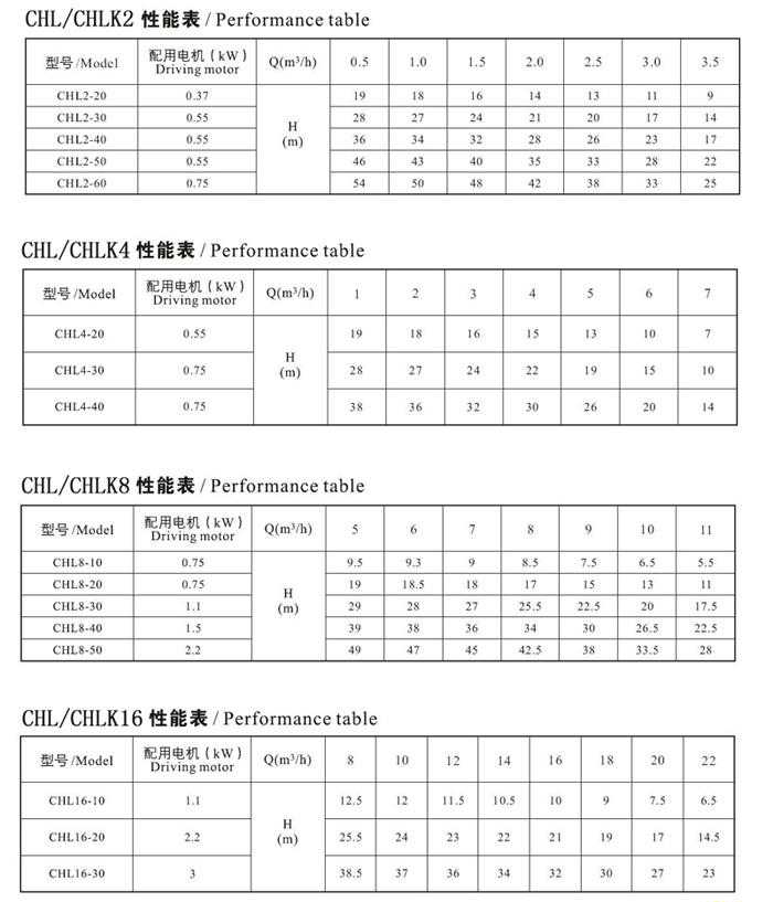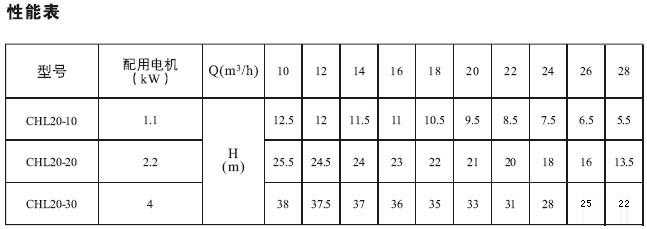 CHL20,CHLK20 輕型不銹鋼臥式多級離心泵性能參數(shù)表