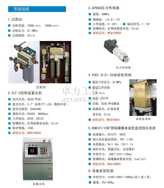 裝置主要由:設(shè)備安裝機(jī)架、控制裝置主機(jī)、隔爆兼本安型直流電源、主閥體、進(jìn)出液壓力傳感器、進(jìn)出液壓力表、電磁先導(dǎo)換向閥、濾筒與濾芯組件、下排污組件、輸液管路組成。