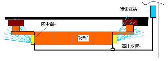 (1)噴霧控塵:采煤機上風(fēng)側(cè)的噴霧控塵器和采煤機機身上的噴霧引導(dǎo)含塵氣流沿煤壁一側(cè)運動,控制粉塵擴散。