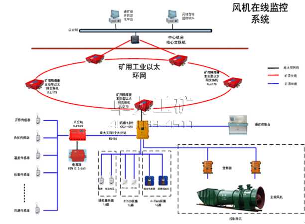 通風(fēng)機監(jiān)控系統(tǒng)作為礦井綜合信息系統(tǒng)的重要組成部分,可以實現(xiàn)在礦井含塵、潮濕、氣流脈動的惡劣環(huán)境下通風(fēng)機性能的在線監(jiān)測功能,同時能夠完成對現(xiàn)場設(shè)備的遠(yuǎn)程控制。主要用來監(jiān)測主通風(fēng)機風(fēng)壓、風(fēng)量、效率、風(fēng)機軸承軸溫、風(fēng)機振動、電流、電壓、功率、風(fēng)機開停、反風(fēng)情況、排風(fēng)口瓦斯?jié)舛鹊戎饕獏?shù)。風(fēng)機運行數(shù)據(jù)可以上傳到監(jiān)控服務(wù)器,減少了有關(guān)的檢查和值班人員,幫助領(lǐng)導(dǎo)和調(diào)度員及時掌握風(fēng)機運行情況。通過本系統(tǒng)可以實現(xiàn)礦井通風(fēng)機風(fēng)壓、風(fēng)量及其它安全參數(shù)的實時在線監(jiān)測,為確保風(fēng)機正常運行、保證煤礦安全生產(chǎn)、減員增效提供了新的技術(shù)手段。系統(tǒng)架構(gòu)