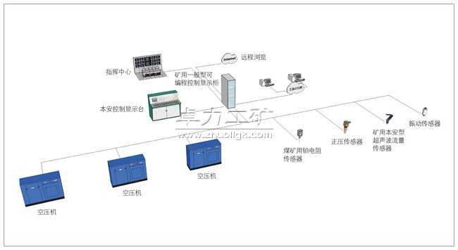 - 整個(gè)系統(tǒng)由礦用礦用一般型可編程控制顯示柜 (PLC)、液晶屏、各種保護(hù)傳感器和集控軟件部分組成。調(diào)度中心與控制站之間通過光纖總線方式連接組成控制網(wǎng)絡(luò),壓風(fēng)機(jī)分站之間即相對獨(dú)立,又互相聯(lián)接,組成一套靈活的系統(tǒng)。
