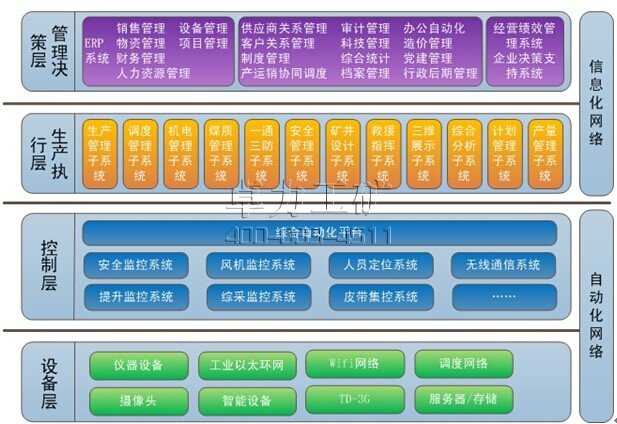 綜合自動化系統(tǒng)的系統(tǒng)架構(gòu)分為四個層次,從下往上依次為設(shè)備層、控制層、生產(chǎn)執(zhí)行層、管理決策層。整個系統(tǒng)可以劃分為兩個網(wǎng)絡(luò)、一個平臺,兩個網(wǎng)絡(luò)是指工業(yè)以太環(huán)網(wǎng)和煤礦辦公信息網(wǎng),一個平臺是指數(shù)據(jù)集成與數(shù)據(jù)應(yīng)用分析平臺,在此基礎(chǔ)之上延伸出針對煤礦行業(yè)特點(diǎn)和生產(chǎn)管理模式而開發(fā)的生產(chǎn)執(zhí)行層、管理決策層數(shù)據(jù)應(yīng)用。