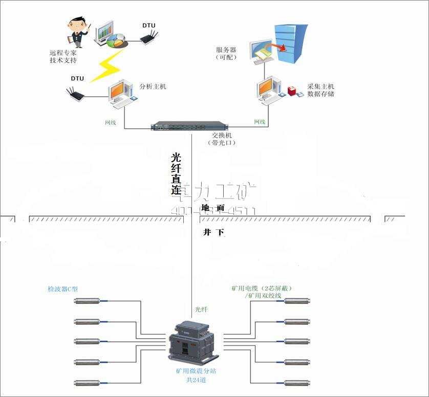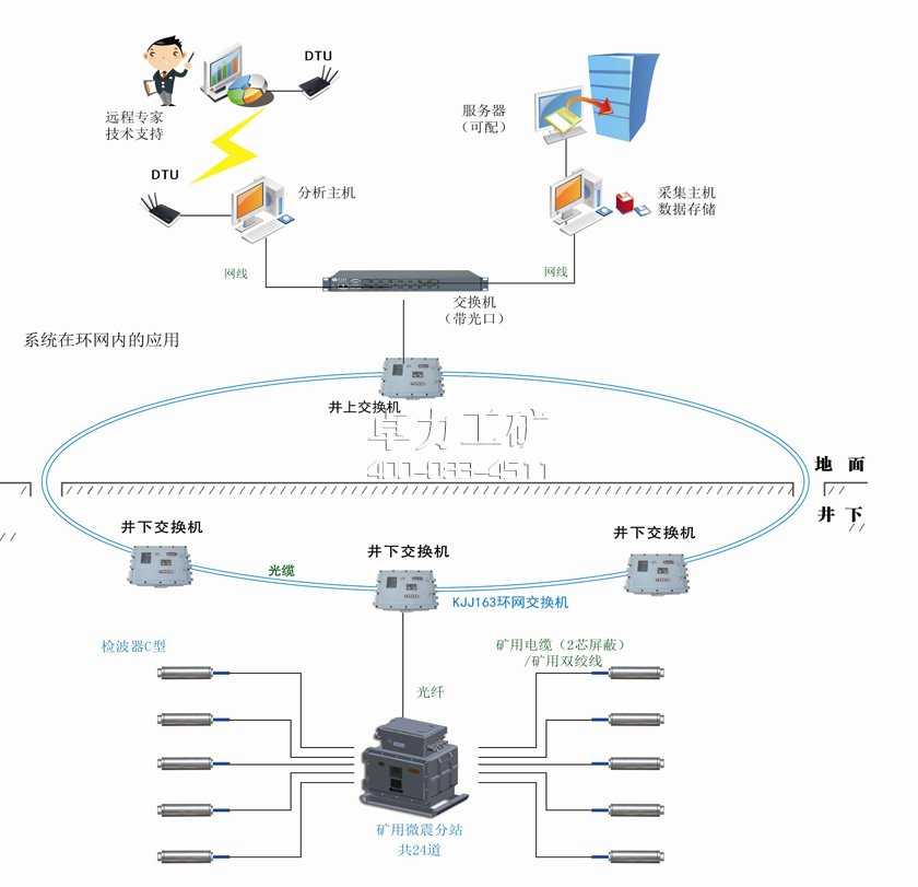 礦用微震系統(tǒng)由采集主機(jī)(服務(wù)器)、分析主機(jī)、交換機(jī)、信號(hào)傳輸設(shè)備(電轉(zhuǎn)光口設(shè)備、光纜、電纜、接線盒)、KJ699礦用微震監(jiān)測(cè)分站、拾震器GZC4.5A、環(huán)網(wǎng)交換機(jī)(地面交換機(jī))、UPS電源、服務(wù)器等組成。