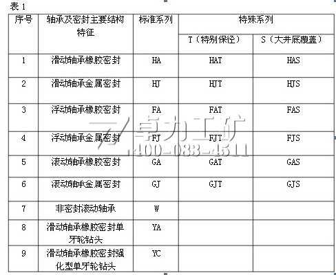 鉆頭系列代號(hào):對于三牙輪鉆頭,按其軸承及密封結(jié)構(gòu)主要特征,分為9個(gè)標(biāo)準(zhǔn)系列。除軸承和密封外,鉆產(chǎn)學(xué)研結(jié)構(gòu)上比較大的改進(jìn)作為特殊結(jié)構(gòu),標(biāo)準(zhǔn)系列與特殊結(jié)構(gòu)或特殊結(jié)構(gòu)的組合組成特殊系列。對于單牙輪鉆頭,鉆頭系列代號(hào)以“Y×”表示,“Y”指一個(gè)牙輪,“×”為設(shè)計(jì)編號(hào),代表不同鉆頭設(shè)計(jì)特征,江漢鉆頭系列代號(hào)見下表1.