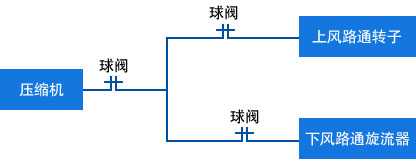三個(gè)球形閥門(mén)分別用于控制主風(fēng)路和通向轉(zhuǎn)子的上風(fēng)路及通向旋流器的下風(fēng)路。另外一上小風(fēng)管用以供風(fēng)給料斗振動(dòng)器。下風(fēng)路還設(shè)有一個(gè)壓力表,以便監(jiān)視輸料管的工作壓力。