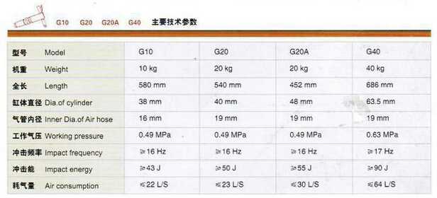 G10.G20.G20A.G40風(fēng)鎬型號(hào)技術(shù)參數(shù)對(duì)照表